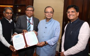 On behalf of National Thermal Power Corporation Limited, NTPC Ltd, Union Minister of Power, Coal and New & Renewable Energy Piyush Goyal on Thursday presented a replica of the Bonus Debentures Certificate of Rs 10307 crore to the Union Finance Minister Shri Arun Jaitley.