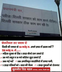 BJP’s Delhi Unit Vice President Kuljit Singh Chahal put the hoardings, which asks Kejriwal why Rs 526 crore is being spent on self-promotion instead of being spent on installing 5 lakh cameras on women’s security, setting up 200 new schools and 50 new colleges, launching 2,000 new buses, providing drinking water to 1,000 unauthorized colonies, providing pension to 5 lakh families for one year or giving employment to 1 lakh unemployed youths.