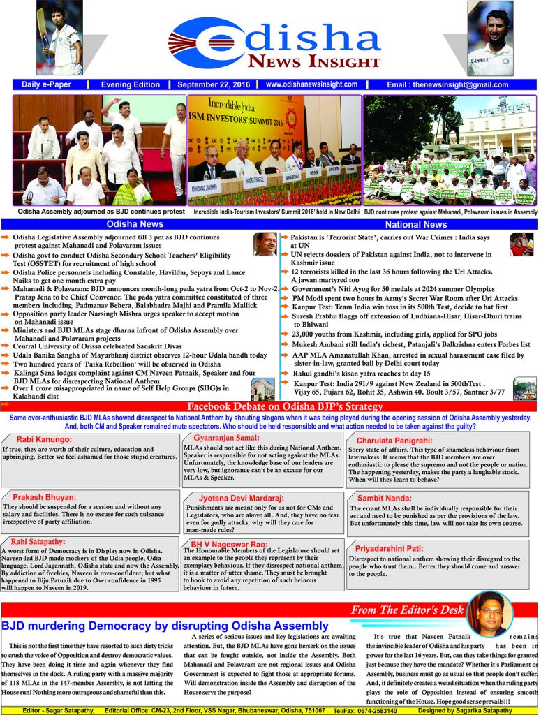Insight Daily e-Paper – September 22, 2016 e-Paper By Odisha News Insight Last updated Sep 24, 2016 4,836 Breaking NewsCurrent AffairsDaily e-PaperIndia News 4,836 Share FacebookTwitterWhatsApp