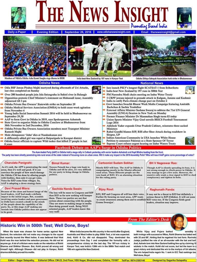 Insight Daily e-Paper, September 26, 2016 e-Paper By Odisha News Insight On Sep 26, 2016 4,690 Breaking NewsCurrent AffairsDaily e-PaperIndia News 4,690 Share FacebookTwitterWhatsApp