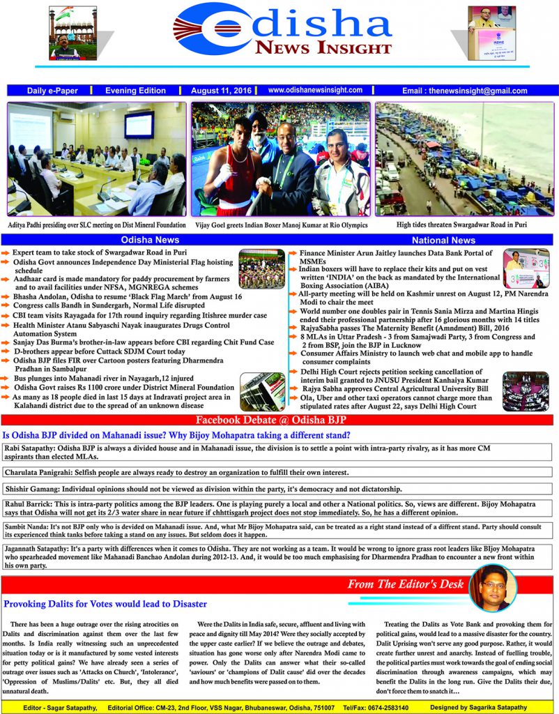 Odisha News Insight (Daily e-Paper) – August 11, 2016 e-Paper By Odisha News Insight Last updated Aug 11, 2016 1,006 Breaking NewsCurrent AffairsDaily e-PaperIndia News 1,006 Share FacebookTwitterWhatsApp
