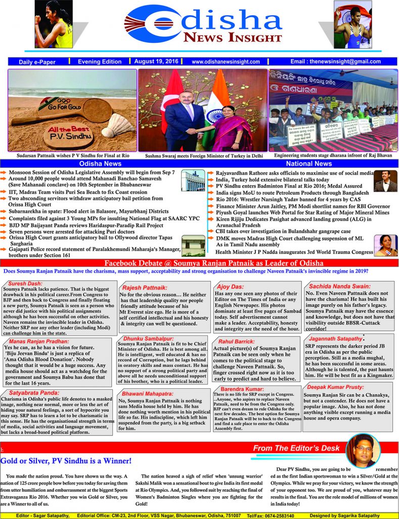 Odisha News Insight (Daily e-Paper) – August 19, 2016 e-Paper By Odisha News Insight On Aug 19, 2016 1,009 Breaking NewsCurrent AffairsDaily e-PaperIndia News 1,009 Share FacebookTwitterWhatsApp
