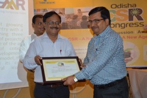 Mr. Dilip Kumar Kar, Program Leader, CSR, received the award from Mr. Charudutta Panigrahi, Founder, FIDR, Gurgaon, and Mr. Ashok K. Das, Director Sankalp TV, Odisha at a glittering ceremony forming a part of the Conclave on “CSR: A New Definition and A New Agenda for Action,” organized by Think Media Inc., at Bhubaneswar on 20 February 2015.