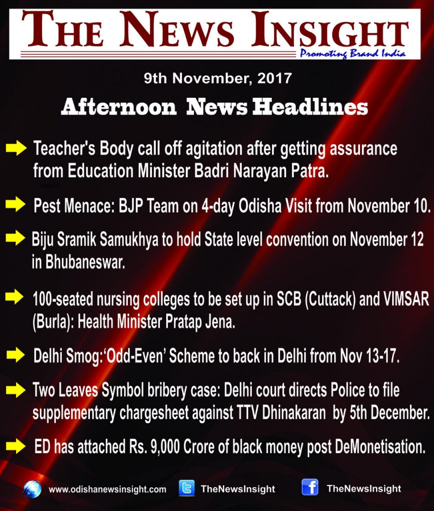 Afternoon News Headlines (November 9, 2017) News Bulletin By Odisha News Insight Last updated Nov 9, 2017 821 Afternoon NewsBreaking NewsNews Headlines 821 Share FacebookTwitterWhatsApp
