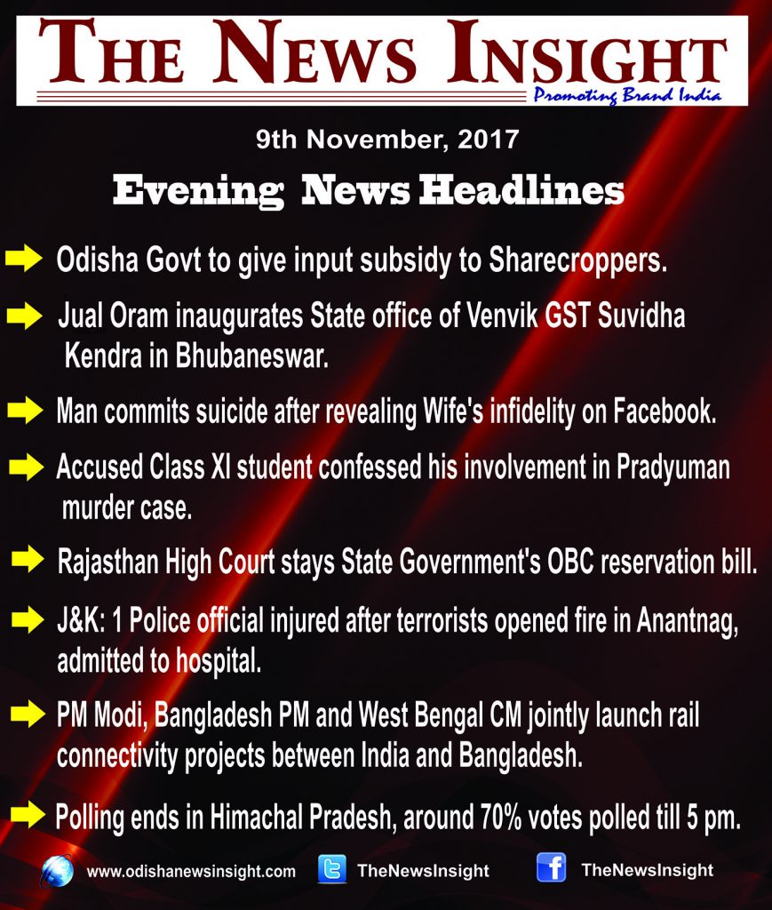 Evening News Headlines (November 9, 2017) News Bulletin By Odisha News Insight On Nov 9, 2017 702 Breaking NewsEvening NewsNews Headlines 702 Share FacebookTwitterWhatsApp