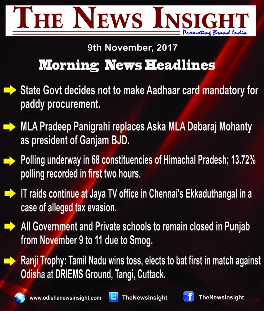 Morning News Headlines (November 9, 2017) News Bulletin By Odisha News Insight Last updated Nov 9, 2017 737 Breaking NewsMorning NewsNews Headlines 737 Share FacebookTwitterWhatsApp