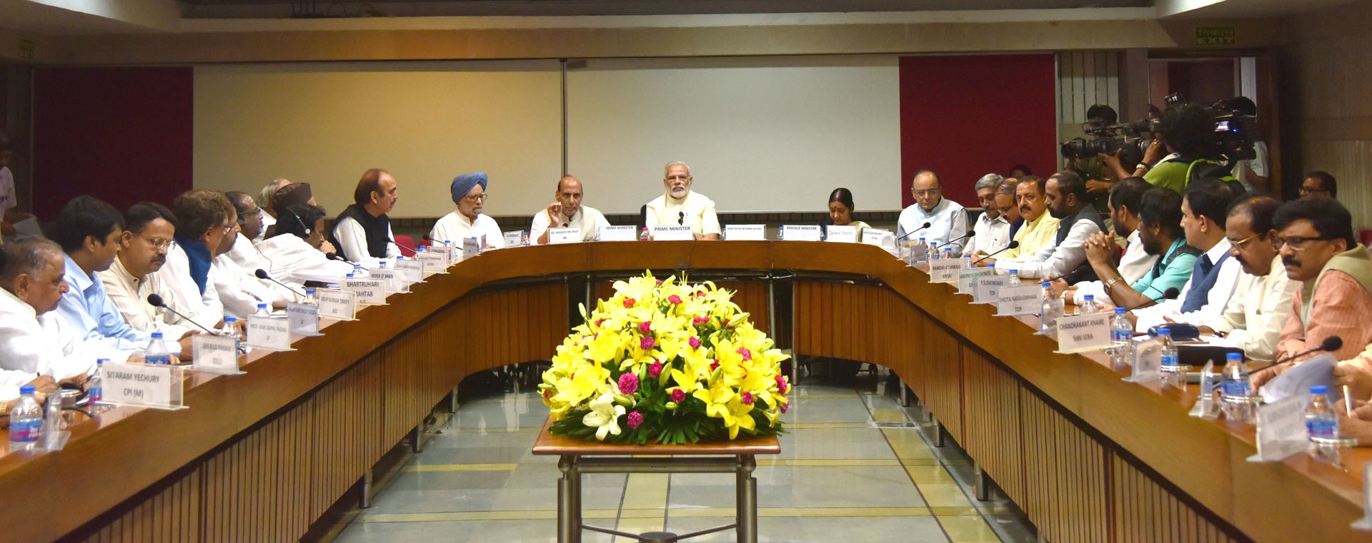 Prime Minister Narendra Modi, Former Prime Minister Dr. Manmohan Singh, Union Ministers, Arun Jaitley , Sushma Swaraj , Congress leaders Dr. Karan Singh, Ghulam Nabi Azad and Mallikarjun Kharge, BJD leaders Dilip Tirkey and Bhartruhari Mahtab, Samajwadi party leader Mulayam Singh Yadav, CPI(M) leader Sitaram Yechury , JD(U) leader Sharad Yadav and leaders of other major political parties were present in the meeting.