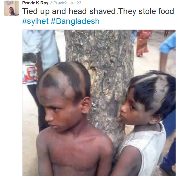 There are numerous examples. But, today I came across yet another such malicious campaign, which forced me to write this. A shocking incident of atrocities on two hungry kids in Sylhet, Bangladesh is being projected as one from Haryana, India. Two poor kids were beaten up, tied up to a tree and got their heads shaved for “stealing” food. Humanity dies there hundred times. We all condemn it.