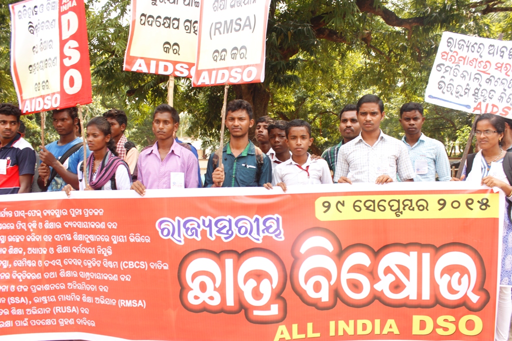 Bhubaneswar, Sep 29: All Indian Democratic Students Organisation (AIDSO) organized a state level demonstration against commercialisation of education here today. Hundreds of students in a well decorated rally marched through the streets to reach at Lower PMG. A protest meeting was held at Lower PMG under the chairmanship of Akshay Das, state president of AIDSO.