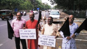 On the 27th day of Bhasha Andolan yesterday, Leaders of Odisha Trade Union, Akuli Chandra Natha, renowned Odia Film Actor, Premanjana Parida, Hindustani classical exponent, Dr Chittaranjan Pani and Artist, Pradipta Mishra join the ‘silent black flag march.
