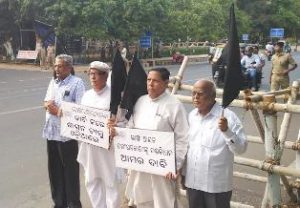 On the 34th day of Bhasha Andolan yesterday, Odisha Byabasayi Mahasangha general secretary Sudhakar Panda, Sri Sakti Sankar Mishra, Legal Advisor join the ‘silent black flag march.