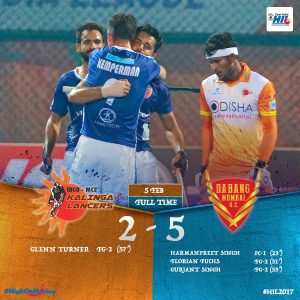 For Dabang Mumbai, Harmanpreet Singh, Florian Fuchs (2) and Gurjant Singh (2) scored the goals. Glenn Turner scored both goals for Kalinga Lancers.