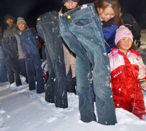 Tokyo, Feb 22: Japan’s Hokkaido village is making a bid for a Guinness World Record with the largest number of frozen pairs of jeans standing upright in the snow.